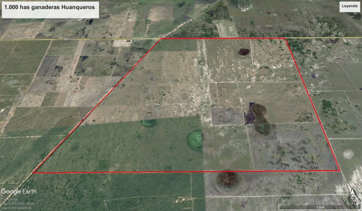 UBICACIÓN: son dos fracciones (una de ellas de 1.000 has y la otra de 1.500 has) de campo casi linderas que se encuentran ubicadas al Oeste de la localidad de Huanqueros, Departamento San Cristóbal, Provincia de Santa Fe. Al sur de la Ruta Provincial No38. COORDENADAS: - 1.000 has: Latitud Sur: 30o 01’ 58,21’’ y Longitud Oeste: 61o 17’ 11,47’’ - 1.500 has: Latitud Sur: 30o 03’ 33.84’’ y Longitud Oeste: 61o 20’ 42,47'' DISTANCIA PRINCIPALES LOCALIDADES: - 7 kms Huanqueros; S F - 45 km San Cristóbal; S F - 155 km Rafaela; S F - 188 km Esperanza; S F - 217 km Santa Fe - 248 km de San Francisco; CBA - 381 km de Rosario; S F - 677 km de CABA DESCRIPCION DEL CAMPO 1500 hectáreas Ganaderas: “El Tarro” Esta fracción tiene una laguna de “agua blanca” de unas 700 a 800 hectáreas, dependiendo de las precipitaciones) La parte alta NO inundable tiene unas 70 hectáreas desmontadas y limpias donde se hacen pasturas y forrajes. El resto del campo tiene monte bajo y abras. 1000 hectáreas ganaderas: San Ramón Es un campo ganadero con un sector norte más de cría, con una receptividad de 0,30 EVH. El sector central y sur apto para recría con bajos dulces, con una receptividad de 0,5 EVH. MEJORAS: EL TARRO de 1.500 has (laguna grande de más de 700 has): tiene mejores infraestructuras. - Casa principal y puesto con luz eléctrica - Manga y corrales completos - Buen alambrado perimetral y 9 potreros - 2 molinos con sus aguadas SAN RAMON de 1.000 has: - Casa patronal, puesto y galpones (en regular estado). No tiene bajada de luz eléctrica (está a unos 3 km) - Manga y corrales en regular estado - Alambrado perimetral y 12 potreros (estado regular de los alambres)